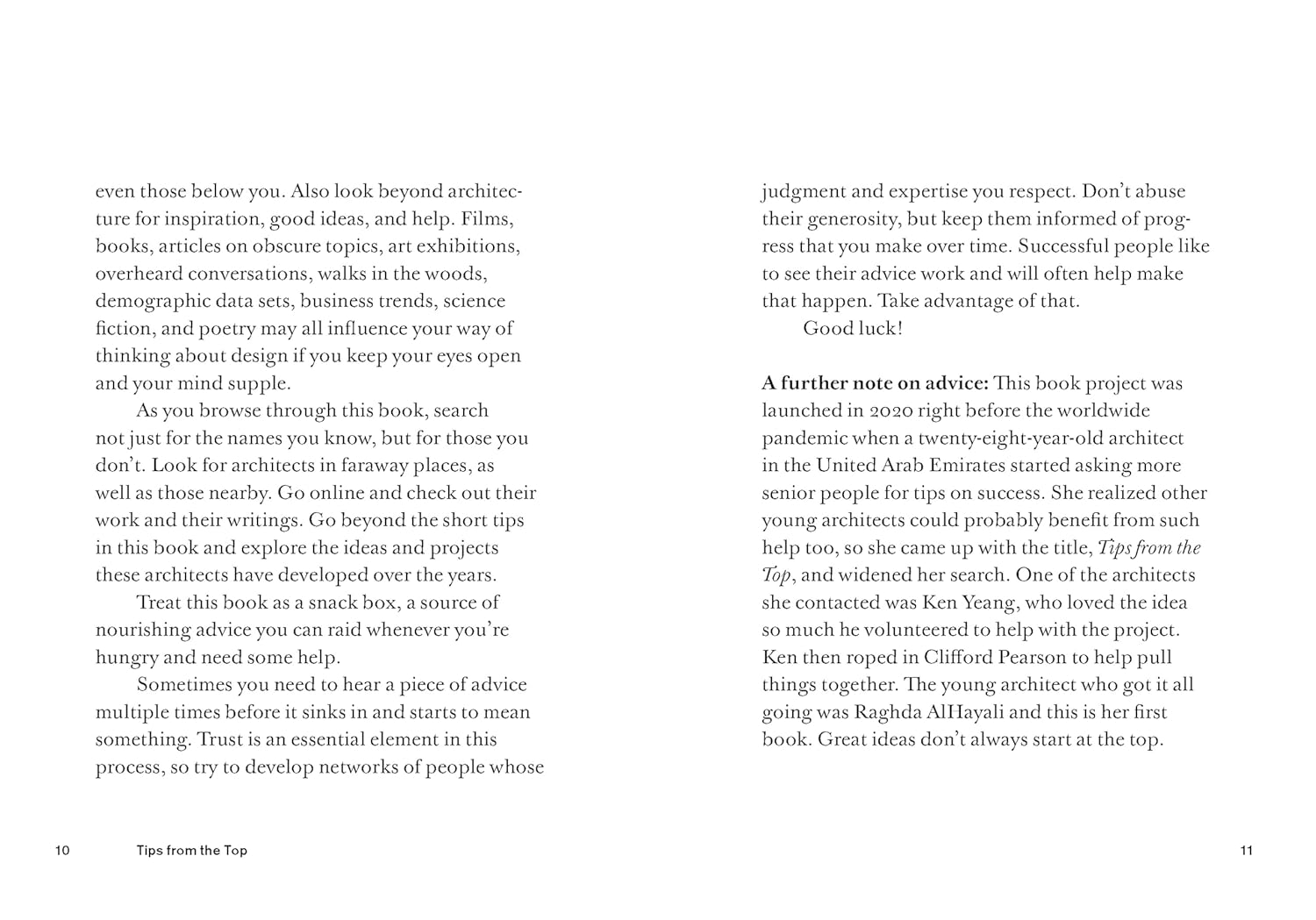 For those just exploring the idea of architecture as a career, students in architecture school, and graduates entering the profession, this book should be treated as a snack box—a source of nourishing advice that can be raided whenever one is hungry and in need of some help.