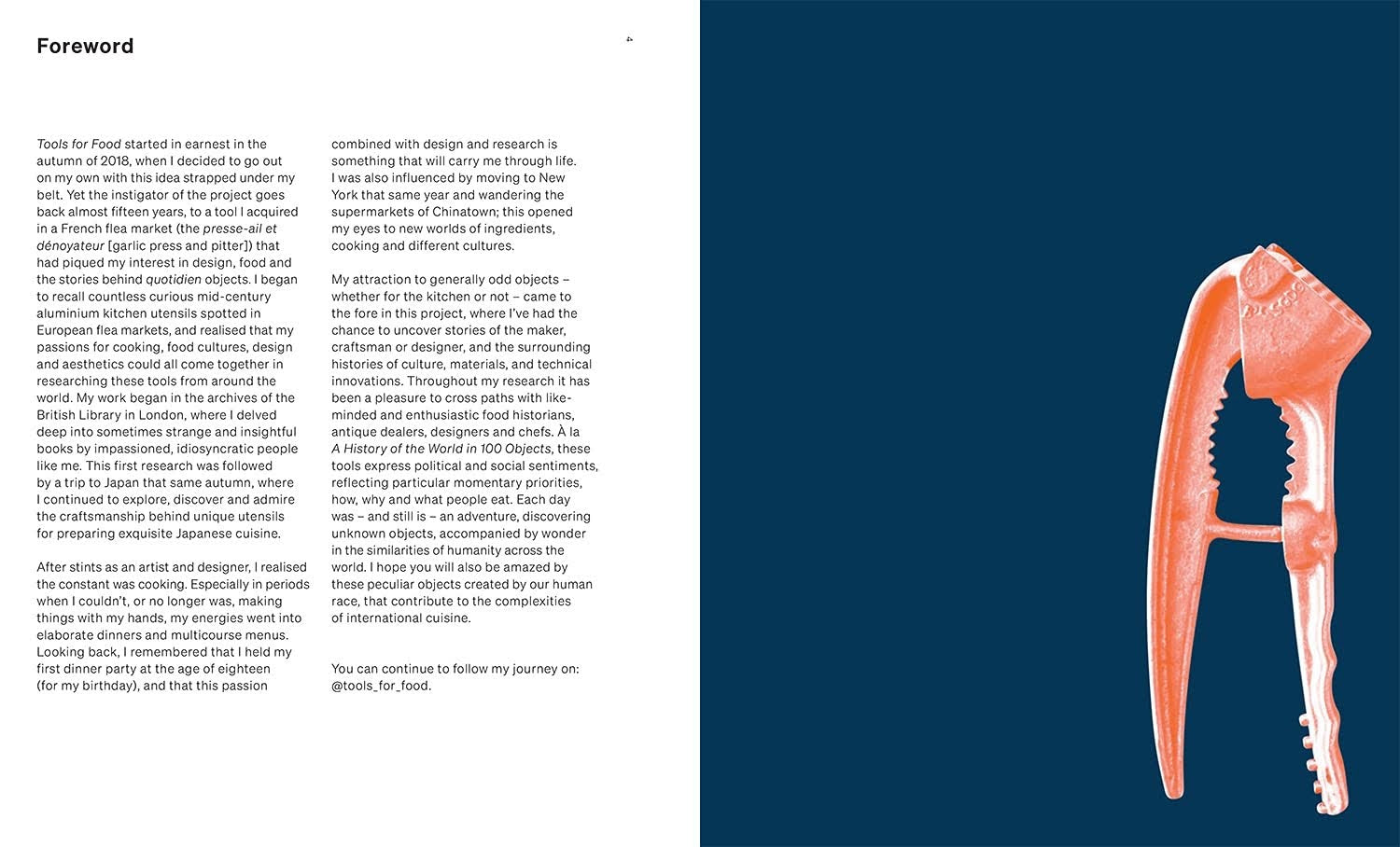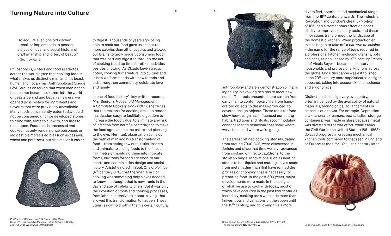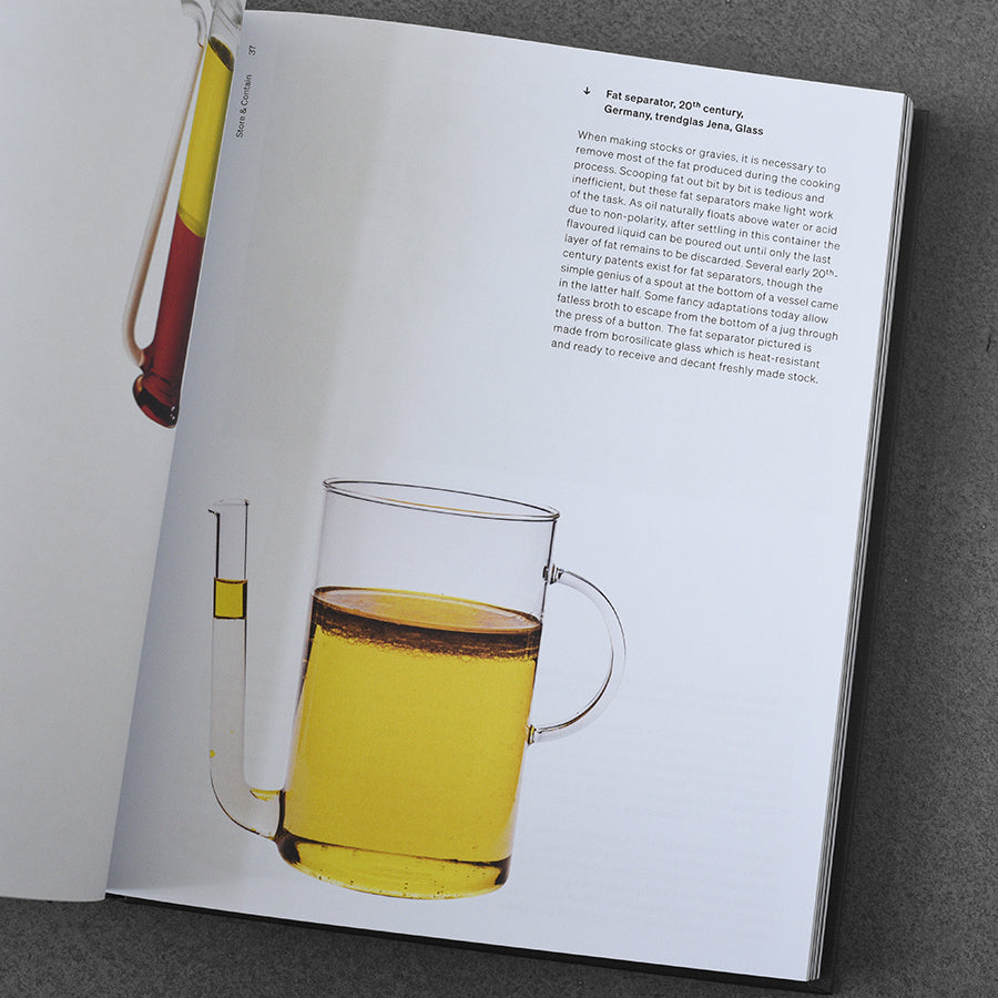 Od prymitywnych narzędzi po wysokiej klasy przedmioty stworzone przez takie marki jak Le Creuseta , Józef Józef IKEA , Tala , dorastanie Pyrex , Dobre chwyty Oxo Droog , Staub i wiele innych, czytelnik zostanie zabrany w podróż dookoła świata, badając, jak i to, co gotujemy, zmieniało się na przestrzeni wieków, pokazując podobieństwa i różnorodność w różnych czasach i kulturach.