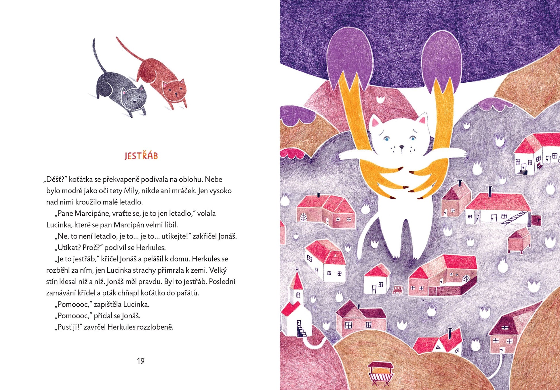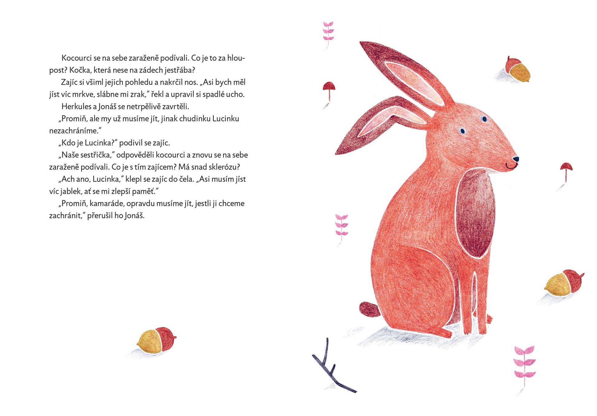 Drogie dzieci, poznajcie Herkulesa, Jonáša i Lucinkę, kociaki, które dorastają pod opieką życzliwej ciotki Mili. Ich wielka przygoda zaczyna się w dniu, w którym mała Lucinka zostaje porwana przez jastrzębia. Herkules i Jonasz nie wahają się ani chwili i biegną za nią. Po drodze spotykają zapominalskiego królika Marchewę i jego przyjaciela orła Maxa. Pomogą kotom uratować ich młodszą siostrę. Stają się dobrymi przyjaciółmi. Na tym jednak historia kociąt się nie kończy. Zanim wrócą do ciotki Mile, przeżyją najróżniejsze przygody...