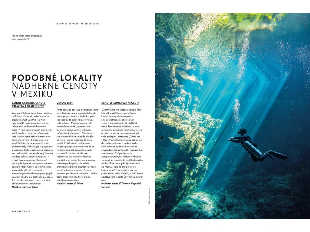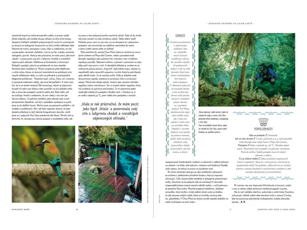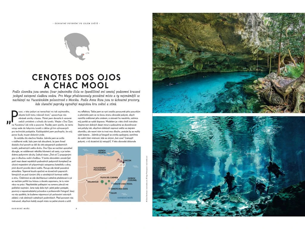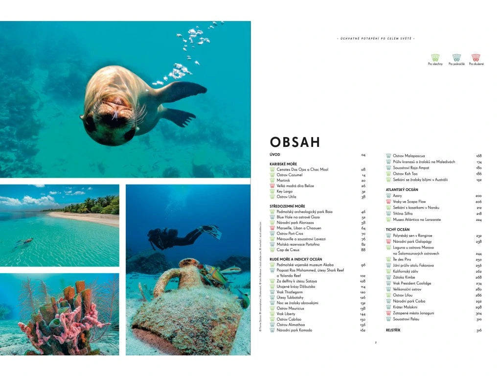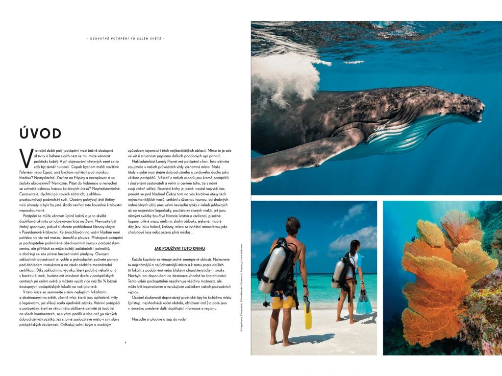 Pod hladinou, kde vládnou převážně odstíny modré a zelené, se ukrývá úchvatný svět. Objevte kolosální žraloky obrovské, korálové útesy pulzující životem, drobné mořské plže či tajuplné vraky. V této knize naleznete 50 výjimečných potápěčských míst, které se zaujetím popisují autorky a autoři vybaveni buďto tlakovými lahvemi, nebo pouhou maskou a šnorchlem, a dalších 150 zajímavých ponorů. Ať už jste potápěč začátečník, nebo zkušený odborník, najdete zde plno zajímavých lokalit k naplánování vlastního dobrodružství či k pouhému snění.
