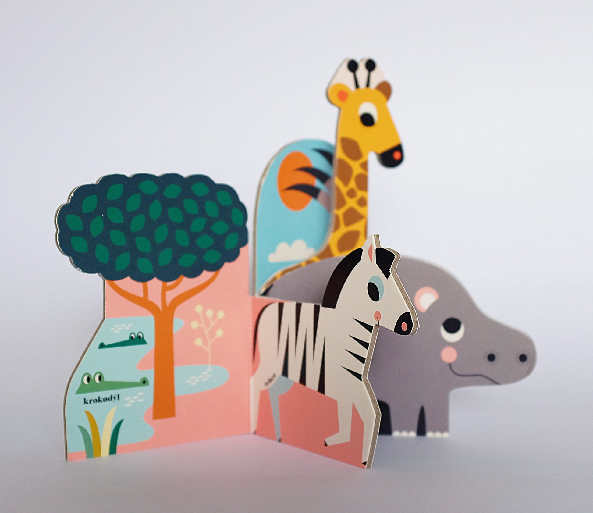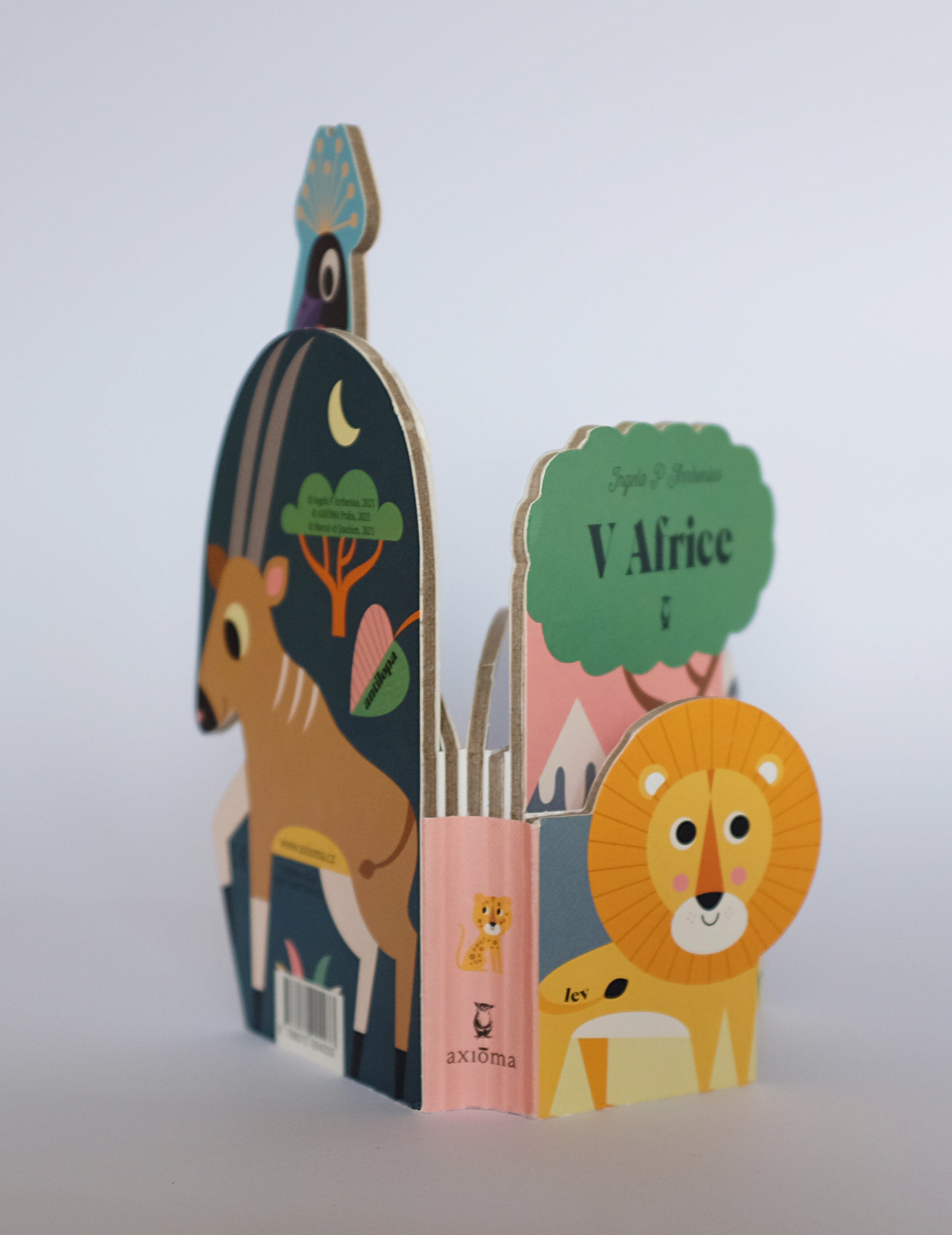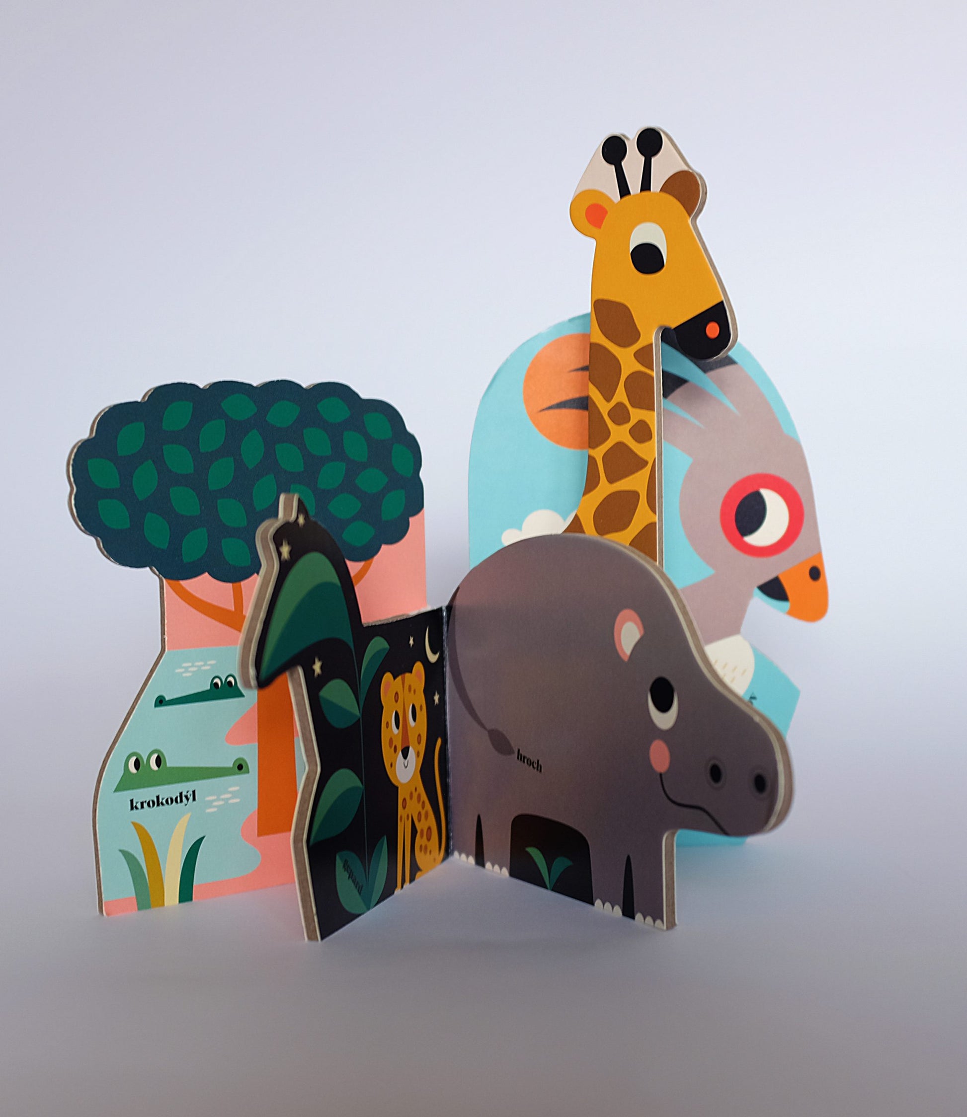 Przestrzenny motyl na granicy książki i zabawki autorstwa światowej sławy szwedzkiej artystki Ingeli P. Arrhenius. Gruby karton, wycięte strony i grzbiet z tkaniny. Dzieci poznają zwierzęta zamieszkujące afrykańską sawannę.