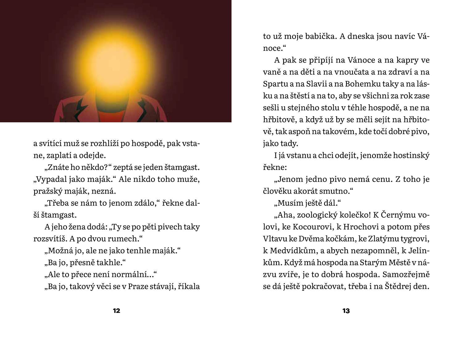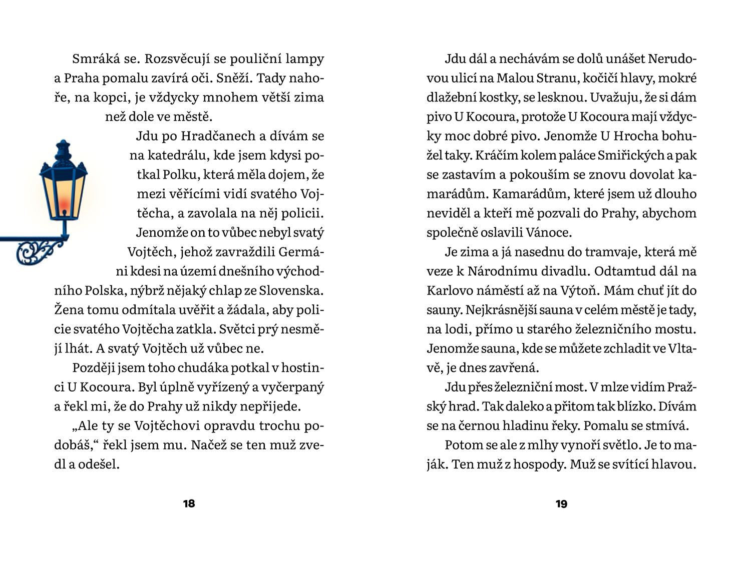 Je Štědrý večer a na pražské hlavní nádraží přijíždí vlakem z Berlína autor této knihy. Kamarádům, se kterými se měl potkat, se nemůže dovolat, a tak se vydá do města sám. Padá sníh, ulice jsou prázdné, zdánlivě nejklidnější den v roce. Vzpomene si, jak se tu jako malý chlapec ztratil. První pivo si dá v hospodě U Černého vola a postupně potká další samotáře — muže, který si říká Kavka a jehož hlava svítí jako stará plynová lucerna, Krále Prahy, který má klíče od celého města, a nakonec půvabnou Italku, vdovu z Milána, jejíž manžel si celý život přál řídit tramvaj podél Vltavy… Čtyři náhodní přátelé putují nočním městem a čekají na zázrak. Daleko od přeplněných vánočních trhů a konzumního šílenství se odehrává kontemplativní příběh, kde melancholické okamžiky střídají vtipné dialogy a mluví se nejen o lásce, literatuře a pivu, ale i o kaprech, kterým z očí koukají zemřelí obyvatelé města. Vánoce v Praze jsou poctou nejen české metropoli a její historii, ale zejména lidem, kteří se někdy v životě cítí úplně sami.