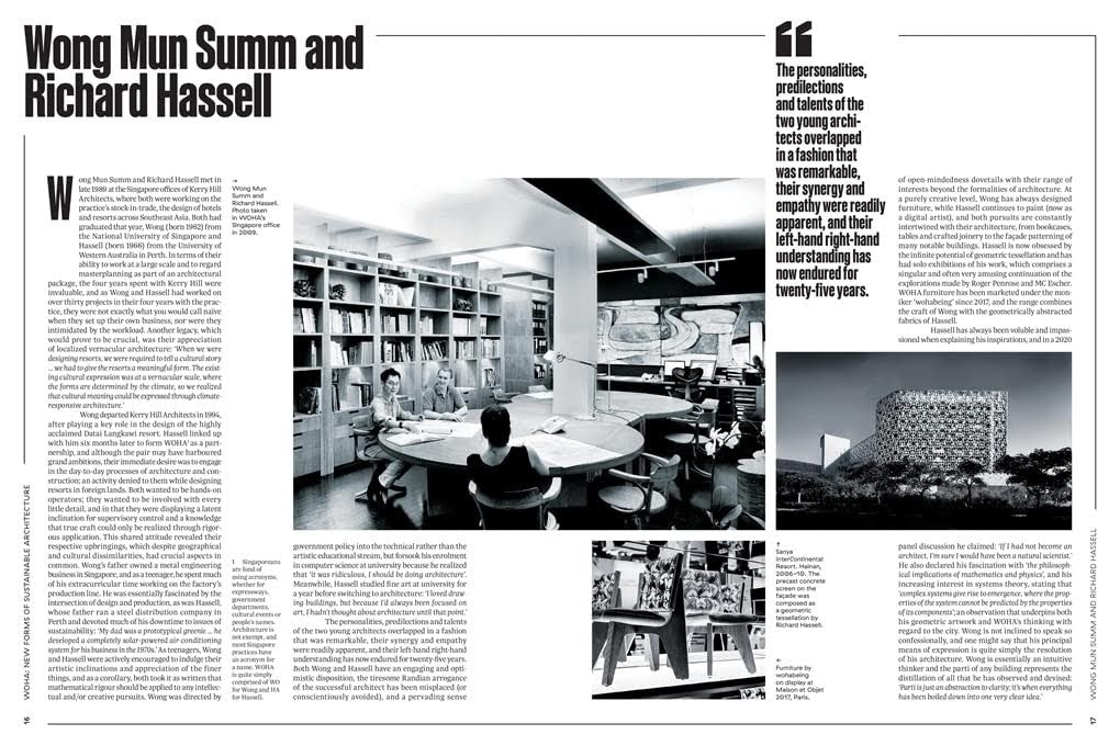 Nawet na najnowocześniejszej scenie architektonicznej Singapuru WOHA wkroczyła na nowe szlaki i nadal to robi w naszych szybko rozwijających się miastach, gdzie dalekowzroczne myślenie jest niezbędne dla zrównoważonego i społecznego rozwoju. Jej projekty rozciągają się od Singapuru po Bangladesz, Chiny i Australię, gdzie ambicje praktyki są realizowane w takich zakładach, jak samowystarczalna dzielnica cyfrowa Punggol w Singapurze.