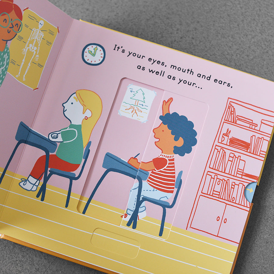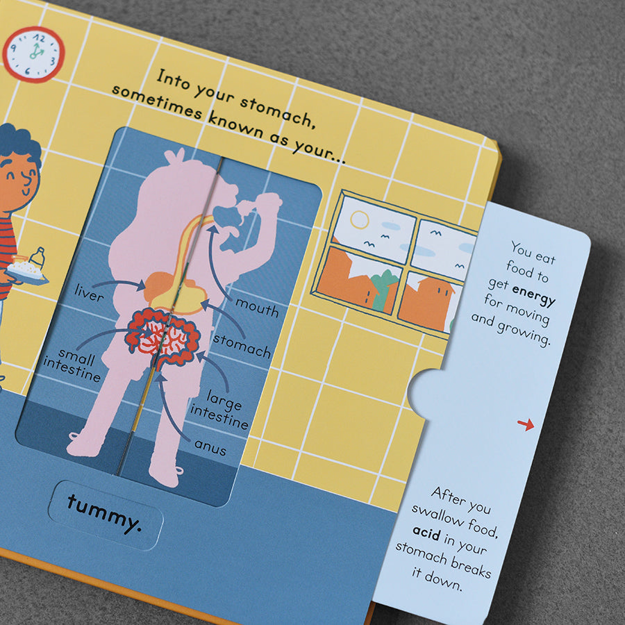 Pociągnij za zakładkę, aby odsłonić wszystko, co kryje się w Twoich wnętrznościach. Od nosa po palce u stóp – jest mnóstwo do odkrycia dzięki magicznie rozpuszczającym się okienkom w tej jasnej książeczce z tektury.