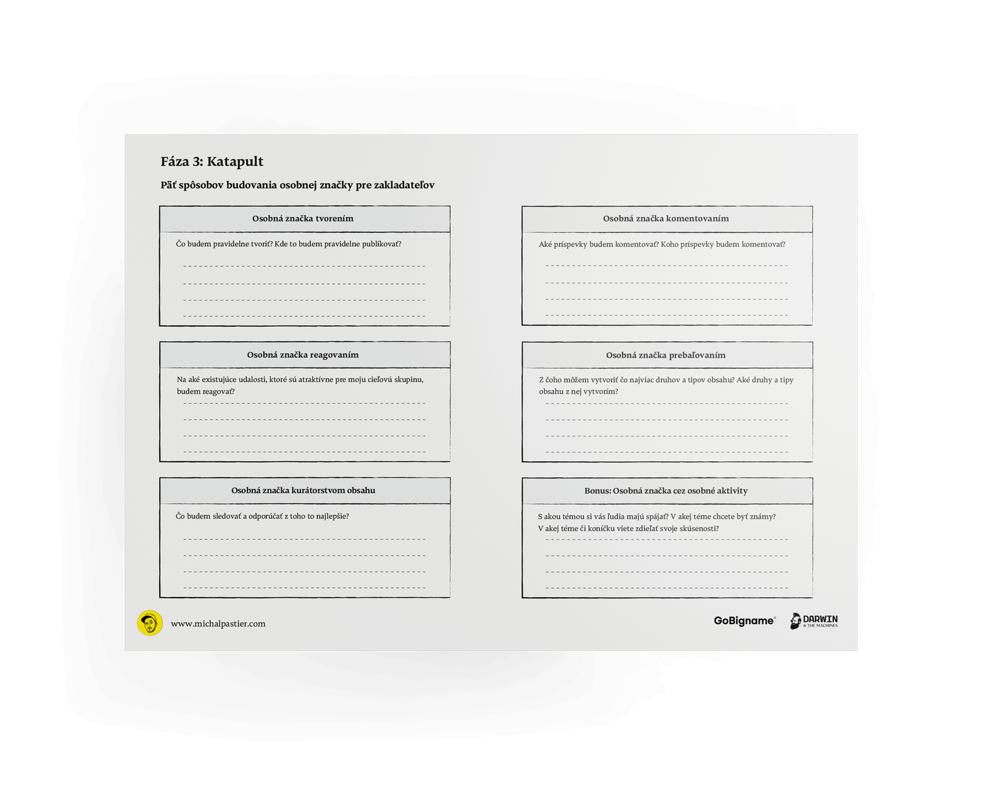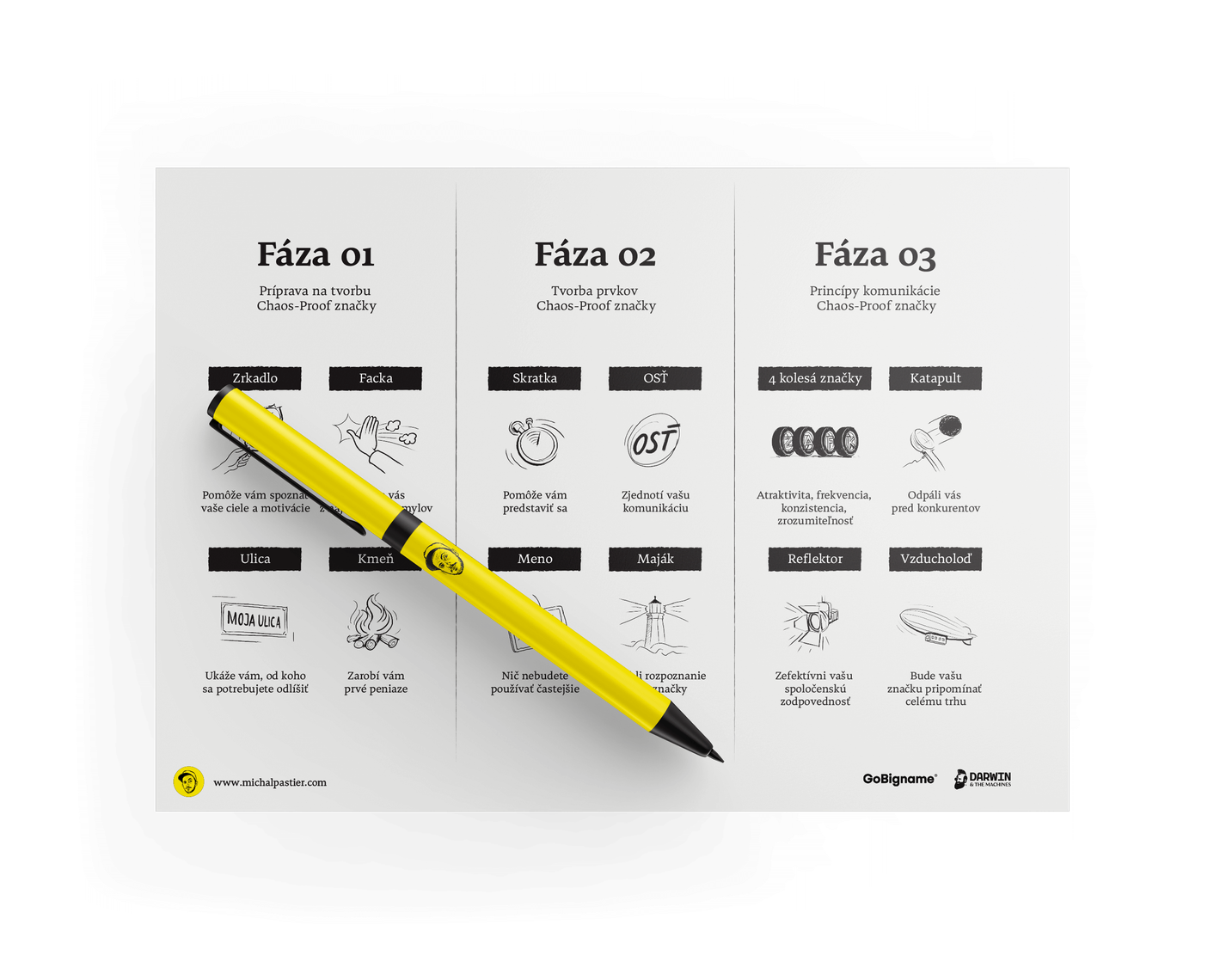 Většina knih o značkách byly knihy designérů pro designéry. Akademiků pro akademiky. Stratégů pro stratégy. Kreativců pro kreativce. Proto jsem chtěl napsat knihu pro budoucí podnikatele, rozjížděče svých značek a nemarketéry. A to tak, aby vás nezabila zbytečnou komplexností a akademičností, ať to, co čtete, umíte rychle použít. Není v ní zbytečně všechno, ale je v ní všechno, co můžete rychle aplikovat. Tato kniha je určena těm, kteří nechtějí filozofovat, co to ta značka vlastně je, ale spíše znát odpovědi na otázky: „Co mám při rozjíždění značky reálně dělat?“ „Na co si dát pozor?“ „Jak postavit vlastní značku rychle a efektivně?“ „Jaké jsou konkrétní kroky pro různé fáze firmy nebo projektu?“ „Co funguje dlouhodobě a co je jenom trend, móda nebo hype?“ „Co má největší dopad na efektivní komunikaci?“ „Proč si firmy právně chrání i svoje barvy?“ „Proč je v Japonsku tolik značek, které mají zpívaná loga?“ „Jak odlišit věci podstatné od věcí naléhavých?“ „Jak nespekulovat a makat?“ – Michal Pastier, Creative Director, Co-founder, angel investor, Darwin & the Machines, GoBigname.